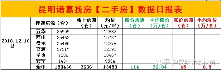 2018年12月10日昆明今日二手房挂牌均价13458元/㎡