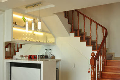 转角楼梯:复式户型最常用的楼梯是转角楼梯,它能充分利用有限的空间来完成两层楼的连接,而且楼梯让空间纵向对称性更好,很好地分割了视觉空间。