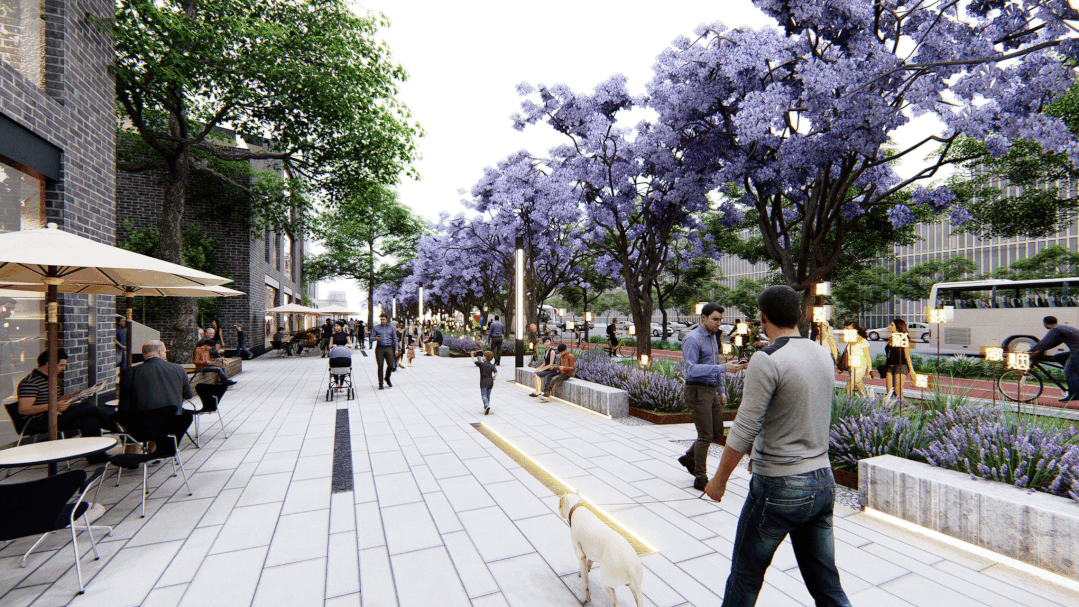 北地块临天府一街界面打造林下花田景观区,街道空间各入口广场、集散场地、滨水空间及集中绿地处种植海棠、玉兰、梅花等传统花乔,再结合建筑立面、景观桥、外摆区等处搭配花卉,营造生动多彩的生活场景和消费场景。