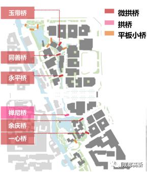 铁像寺水街一期打造6座跨肖家河桥,均以成都古桥梁名命名。二期也传承了这一文脉,6座桥梁分别命名玉带、同善、永平、禅尼、余庆、一心,皆取自成都古桥,同时选用传统西蜀园林桥梁意向,打造本土园林水街景观。历史变迁、沧海桑田在此呈现,城市水文化因此得以传承和创新。目前,六桥均已完工,正在进行桥下景观打造。
