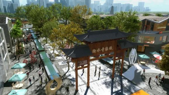 求贤牌坊与一期的进士牌坊形成东西呼应,并结合升庵紫藤景点构建起寓意招贤纳士、开明求贤的“水街人才流线”。