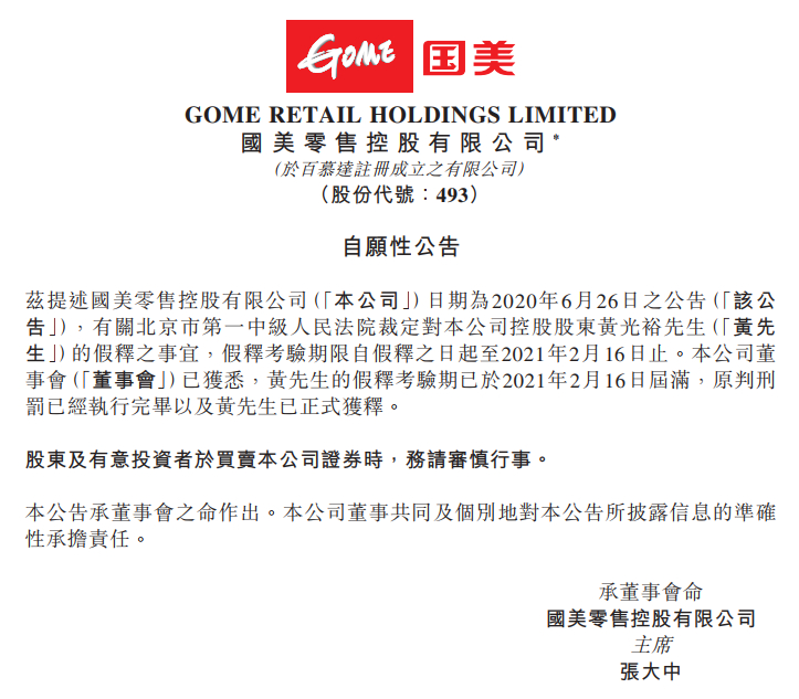 公告显示,国美零售控股有限公司日期为2020年6月26日之公告显示,有关北京市第一中级人民法院裁定对本公司控股股东黄光裕的假释之事宜,假释考验期限自假释之日起至2021年2月16日止。公司董事会已获悉,黄先生的假释考验期已于2021年2月16日届满,原判刑罚已经执行完毕以及黄先生已正式获释。