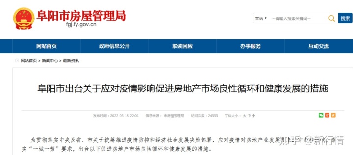 5月18日,阜阳市房屋管理局官网披露《阜阳市出台关于应对疫情影响促进房地产市场良性循环和健康发展的措施》(简称《措施》)。