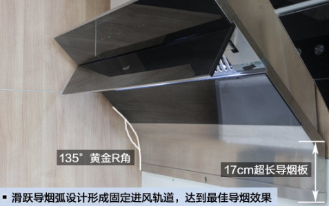 烟机下端采用了滑跃导烟弧设计,17cm的超长导烟板加上135°的黄金R角设计形成固定的进风轨道,能够实现最佳的导烟效果。