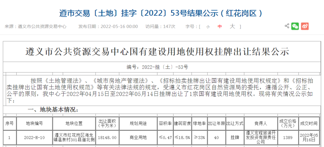 5月16日,据遵义市公共资源交易中心公示,红花岗区海龙镇温泉村301县道北侧一宗商业用地成交,地块编号2022-H-10,竞得人遵义宏程旅游开发投资有限责任公司。