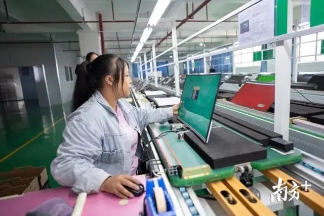 一台台电脑显示屏,在流水线上推移。工人们手脚麻利,完成组装、检测、包装等一道道工序。工厂门口,货车即将满载电脑显示屏,运往全国各地。