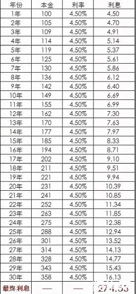 那么,如果是全款买房呢?相比去贷款100万买房,全款买房需要多花100万现金。如果将这100万现金存到银行,30年下来有多少利息呢?现在银行定期存款的利息一般都在4%左右,有时候一些银行做活动会上调银行定期存款利息,那么就按照4.5%的利息存30年,咱们看看利息到底有多少。