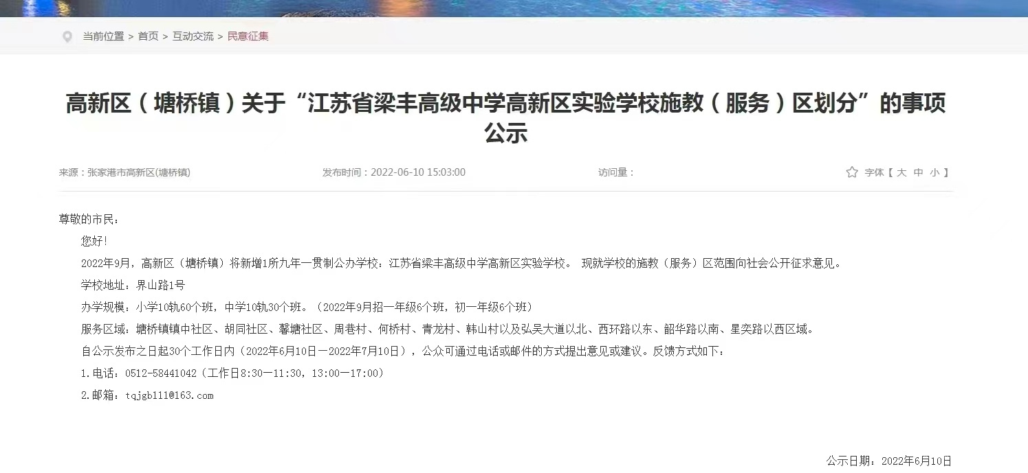 2022年9月,高新区(塘桥镇)将新增1所九年一贯制公办学校:江苏省梁丰高级中学高新区实验学校,小学10轨60个班,中学10轨30个班。(2022年9月招一年级6个班,初一年级6个班)