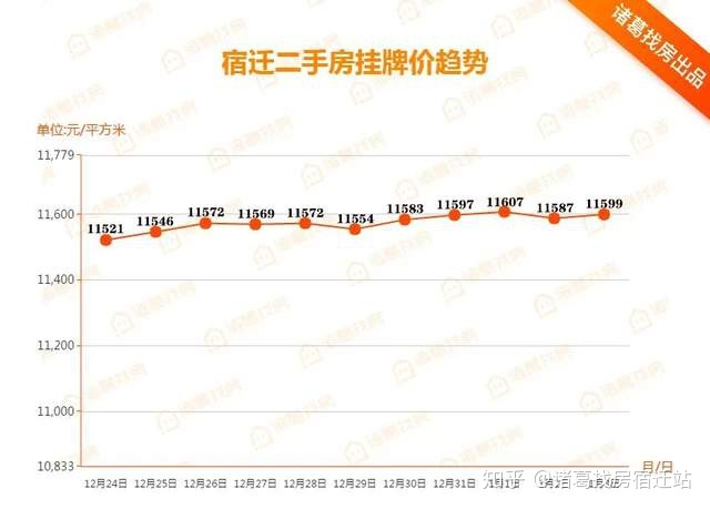 据诸葛找房数据研究中心监测,2020年12月24日至2021年1月3日,宿迁市二手房市场均价为11573元/㎡,环比上周上涨0.20%,整体二手房保持缓慢波动性上涨,单日均价皆11500元/㎡朝上。