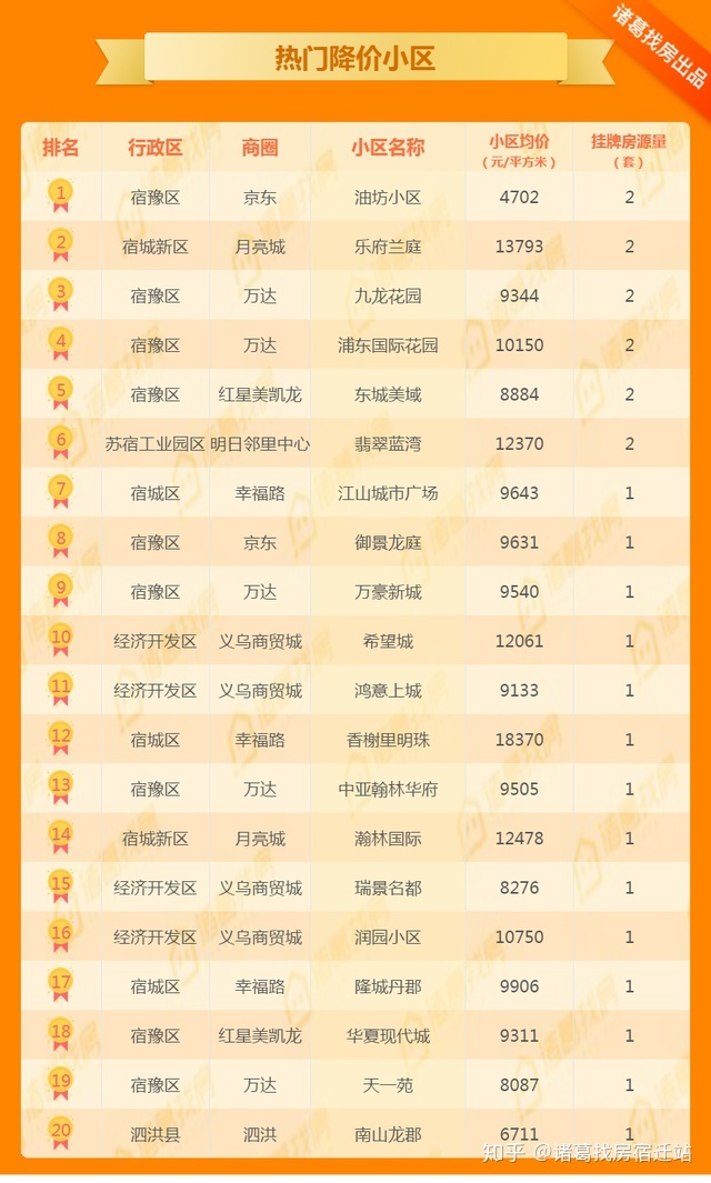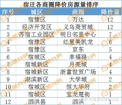 上周商圈降价房源量TOP里宿豫区万达商圈和经济开发区义乌商贸城商圈以12套降价房源量并列排名第一。