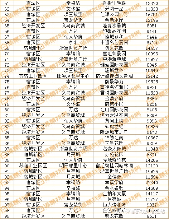 2020年12月28日至2021年1月3日,宿城区4066套挂牌房源最多,环比上涨1.73%、其次是经济开发区2805套,环比下降1.58%、宿城新区2066套,环比下降0.58%、宿豫区1999套,环比上涨14.89%、苏宿工业园区1906套,环比上涨0.79%、湖滨新区(175套)、泗洪(80套)、泗阳(33套)、沭阳(12套)、洋河新区(5套)。