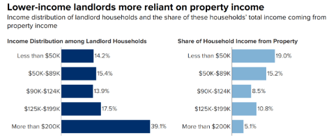例如,租金弥补了那些使不到一年$ 50,000家庭收入的19%,而对于那些做$ 50,000到$ 89,000每年15%的分析发现。相比之下,年收入超过20万美元的住宅房东的年收入中约有5%来自租金。