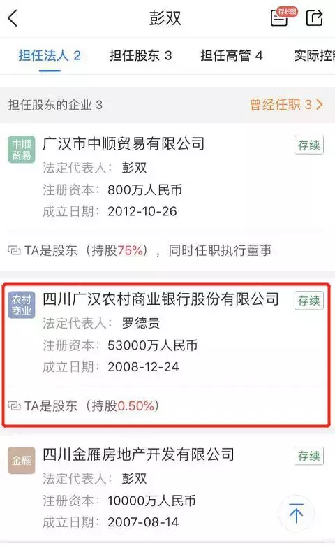 与此同时,该房企的大股东彭双,目前还持有四川广汉农村商业银行股份有限公司0.5%的股份。