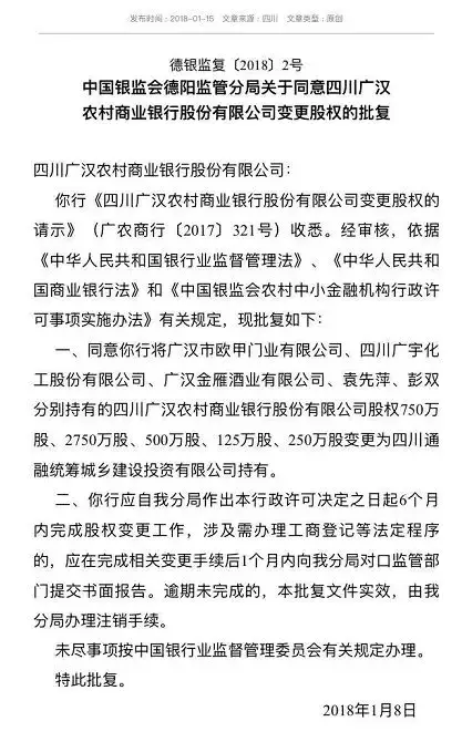 另外,2018年1月,《中国银监会德阳监管分局关于同意四川广汉农村商业银行股份有限公司变更股权的批复》显示,彭双等持有的四川广汉农村商业银行股份有限公司股权,变更为四川通融统筹城乡建设投资有限公司持有。