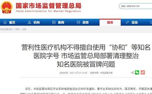 市场监管总局部署清理整治知名医院被冒牌问题 营利性医疗机构不得擅自使用“协和”等知名医院字号