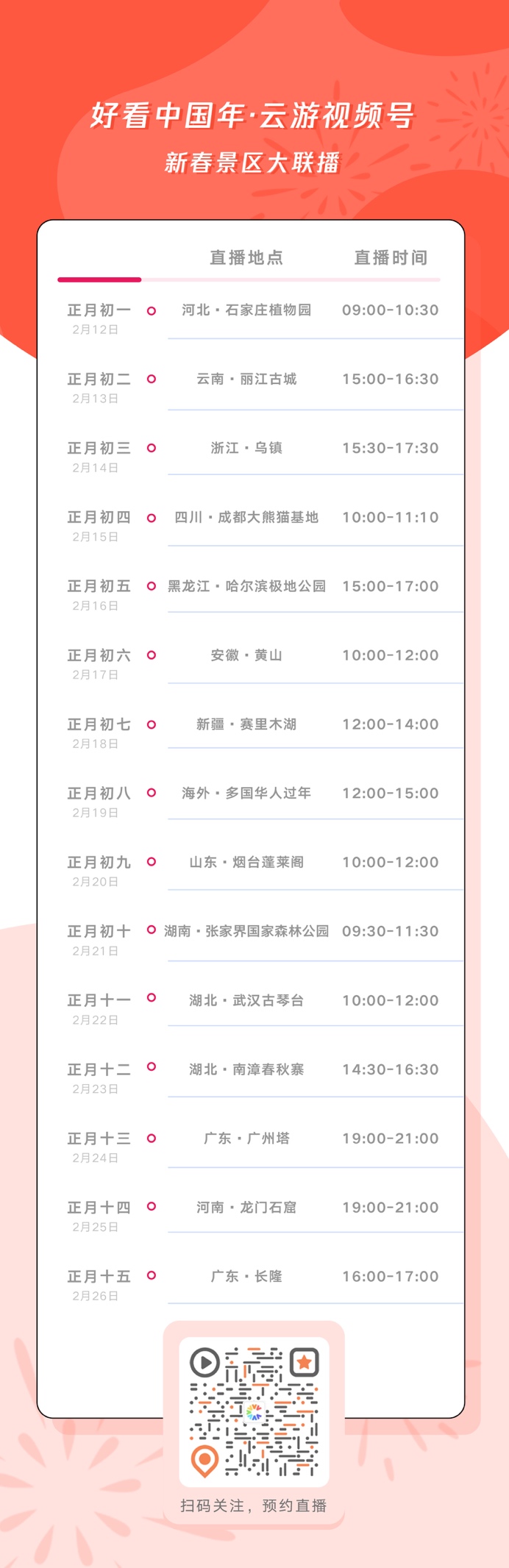 为帮助大家足不出户游览全国各地美景,感受各地年味儿,微信将联合河北石家庄主流媒体、云南丽江古城、浙江乌镇、黑龙江哈尔滨极地公园、四川成都大熊猫基地、山东烟台蓬莱阁、河南龙门石窟等15个城市的知名景点联合打造基于视频号直播能力的“好看中国年·云游视频号”新春大联播。