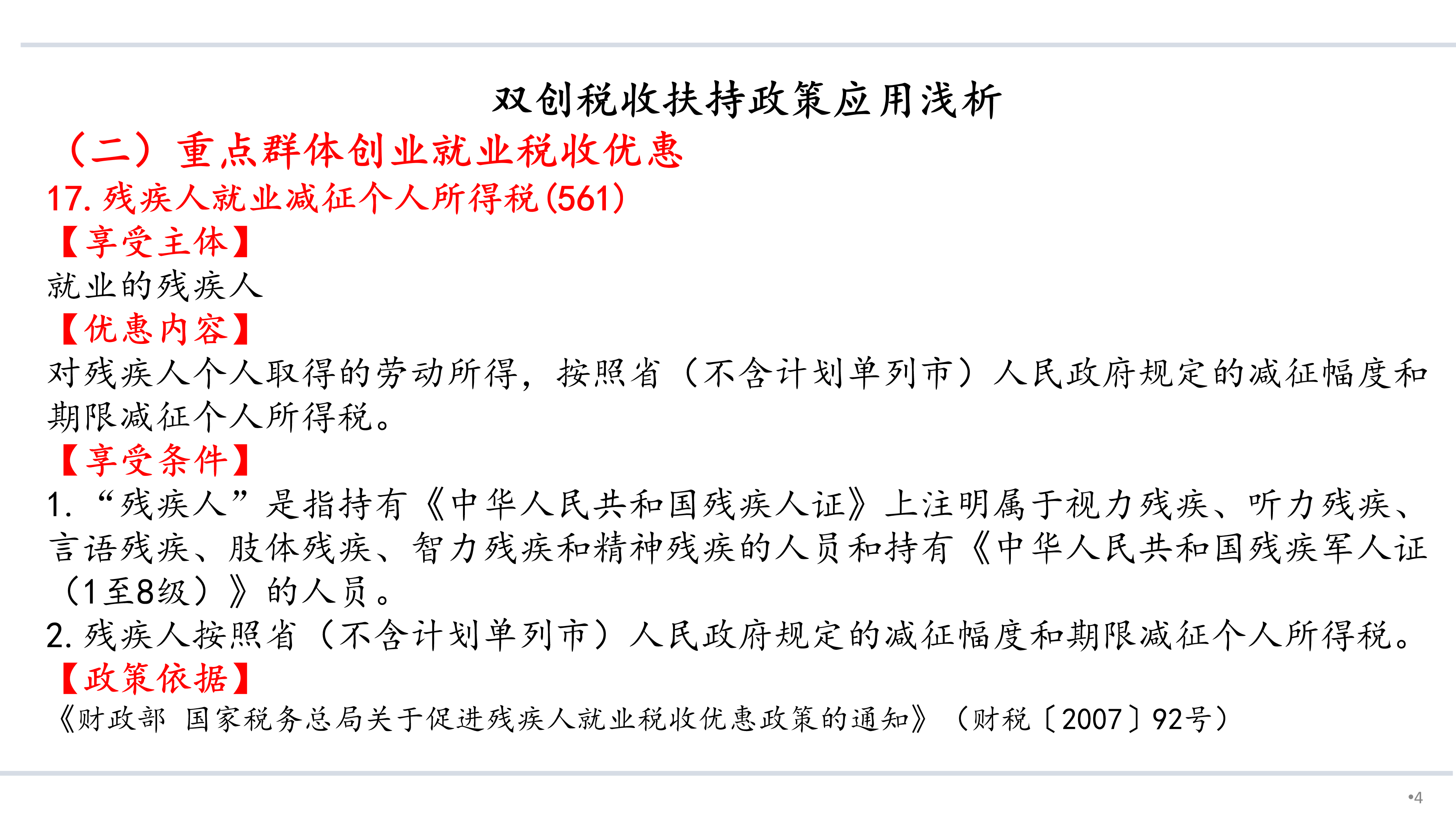 1)享受税收优惠的残疾人是指持有第二代《中华人民共和国残疾人证》并注明属于视力残疾、听力残疾、言语残疾、肢体残疾、智力残疾、精神残疾和多重残疾的人员,以及持有《中华人民共和国残疾军人证(1至8级)》的人员;