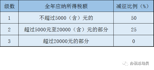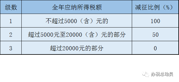 ① 残疾程度为中度以上,即残疾等级为一、二、三级(视力、听力、言语、肢体、智力、精神、多重)的残疾人,一级至六级(含六级)的转业、复员、退伍的革命伤残军人,其个人所得税减征幅度与孤老、烈属相同,即: