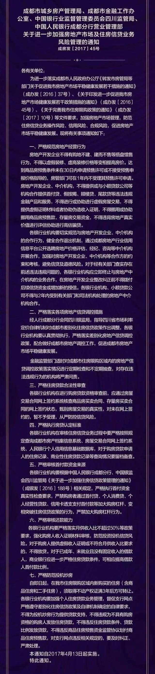 解读:这一条继续强调“ 严格贯彻’房子是用来住的,不是用来炒的’定位。”市房管局解释,从4月13日起,新在成都住房限购区买房,无论是商品住房还是二手住房,不包括商业、公寓,在拿到不动产权证3年后,才能转让。