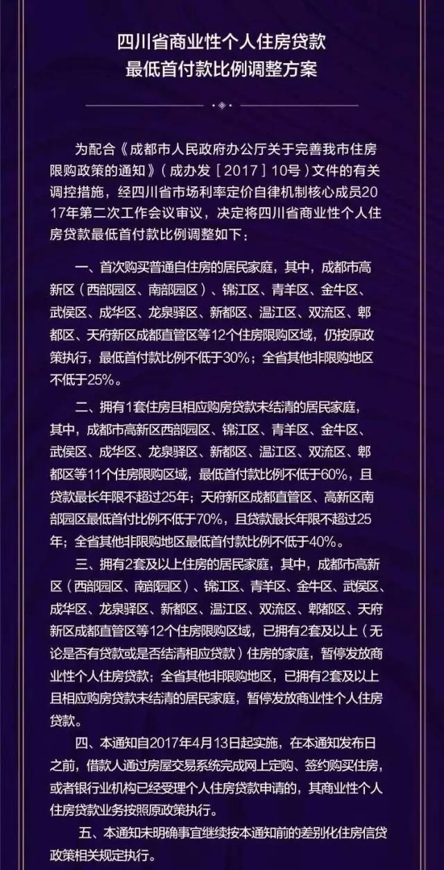 拥有1套住房且相应购房贷款未结清的居民家庭,其中,成都市高新区西部园区、锦江区、青羊区、金牛区、武侯区、成华区、龙泉驿区、新都区、温江区、双流区、郫都区等11个住房限购区域,最低首付款比例不低于60%成都二套房首付比例2016,且贷款最长年限不超过25年;天府新区成都直管区、高新区南部园区最低首付比例不低于70%,且贷款最长年限不超过25年;全省其他非限购地区最低首付款比例不低于40%。