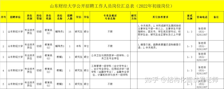 初级岗位报名时间:2022年3月21日9:00—3月29日16:00初级岗位查询时间:2022年3月22日9:00—3月30日16:00报名方式: 报名人员登录烟台大学人事处网站(登陆,点击“人才招聘”,下同)点击浮窗“烟台大学公开招聘报名系统”(以下简称“报名系统”)(三)考试考试分为笔试和面试。具体时间、地点另行通知,请应聘人员关注烟台大学人事处网站。1.教师岗位23、24、25、26、27教师岗位23、24、25、26、27考试采取先面试后笔试的方式进行。①面试面试采取模拟课堂教学(专业技能测试)和专家现场提问的方式进行,模拟课堂教学(专业技能测试)和专家现场提问各占面试成绩的50%。模拟课堂教学(专业技能测试)主要测试应聘人员对专业知识的课堂运用能力、教学方法与技能等。专家现场提问主要测评应聘人员的专业知识、业务常识、综合分析能力、语言表达能力、临场应变能力等。面试总分为100分,设定面试合格分数线为60分德州医院招聘信息,面试结束后及时公布面试成绩,并从达到面试合格分数线的应聘人员中,按面试成绩由高分到低分按招聘计划1:3的比例依次确定进入笔试人选。达不到规定比例的,按实有合格人数确定笔试人选。②笔试笔试主要考察应聘人员适应本岗位的专业知识,总分为100分,设定笔试合格分数线60分。达到笔试合格分数线的方可进入考察体检范围。笔试结束后,按面试成绩占60%和笔试成绩占40%的比例百分制合成考试总成绩。面试成绩、笔试成绩、总成绩均计算到小数点后两位数,尾数四舍五入。同一招聘计划应聘人员出现总成绩并列的,则按笔试成绩由高分到低分确定人选。考试总成绩和考生名次在报名系统或烟台大学人事处网站公布。2. 辅导员岗位1-4、教师岗位28-30、实验技术岗位1-12、工程实训指导教师岗位1和辅助岗位1-3辅导员岗位1-4、教师岗位28-30、实验技术岗位1-12、工程实训指导教师岗位1和辅助岗位1-3先笔试后面试的方式进行。①笔试笔试主要内容根据专业及岗位特点确定。主要测试应聘人员所必需的公共基础知识和与岗位相适应的专业知识,笔试总分100分,设定笔试合格分数线为60分。