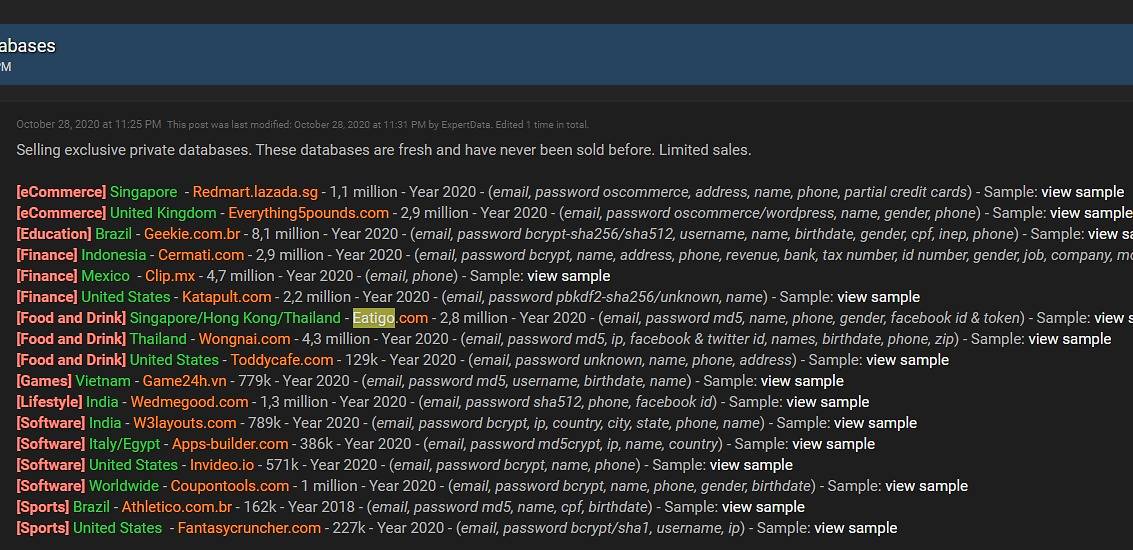 阅读:Lazada将RedMart折叠到其平台中,标志着进入在线超市业务该在线论坛的Screengrab据说是从包括Lazada在内的世界各地的各种电子商务网站销售个人数据。