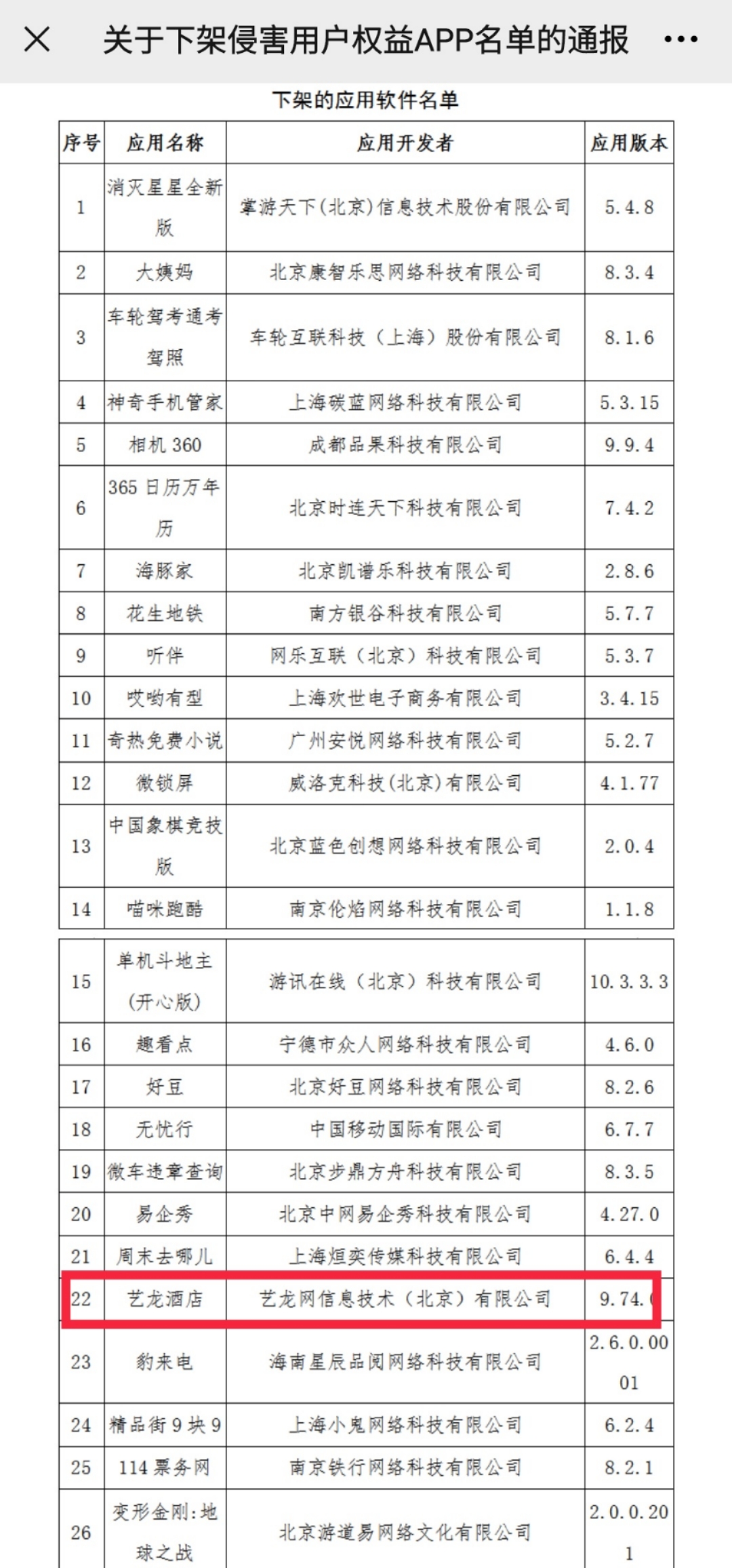 工信部:下架37款侵害用户权益APP 艺龙酒店在列