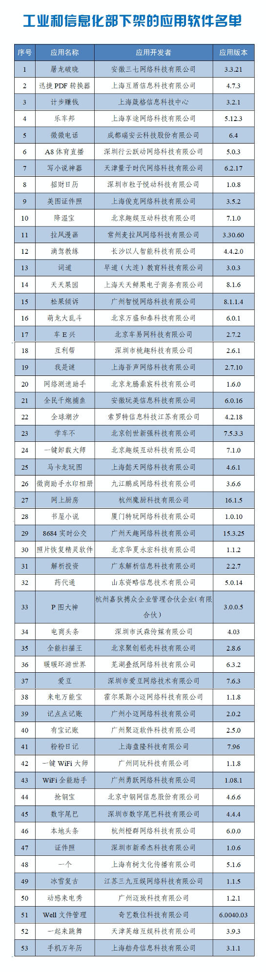 工信部今天(6日)发布“关于下架侵害用户权益App名单的通报”。通报称,在2021年3月11日,工信部向社会通报了136家存在侵害用户权益行为App企业的名单。截至目前,经第三方检测机构核查复检,尚有53款App未按照要求完成整改。