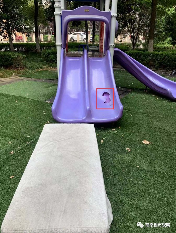 滑梯破了洞,破旧的垫子放在滑梯底部防摔倒。