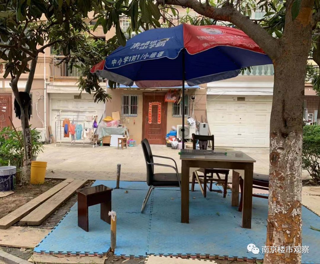 绿化带中铺上了垫子,架起了大伞,成了业主们纳凉的地方。