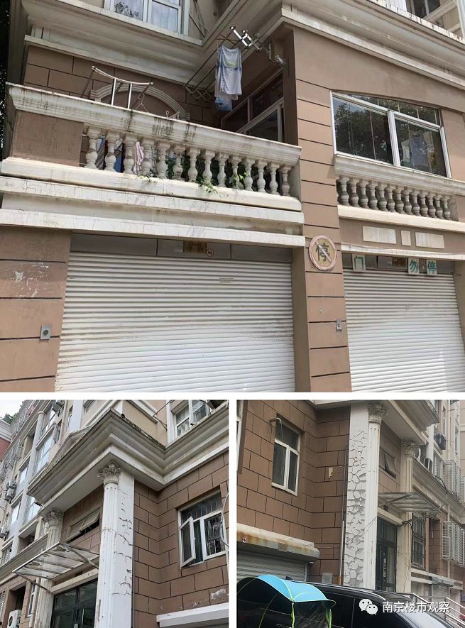 楼栋外立面上有不少的污渍,墙体受潮脱落的现象比较多。