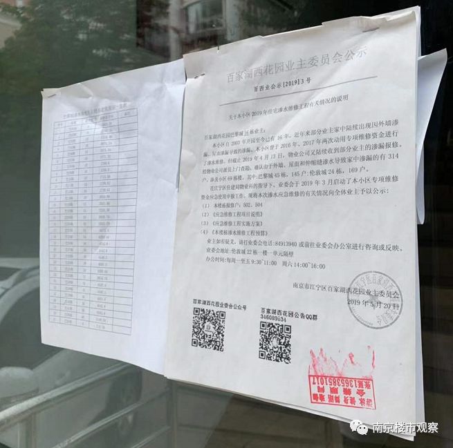 楼栋外的玻璃门上贴着关于业主家中墙面渗水的维修情况说明。