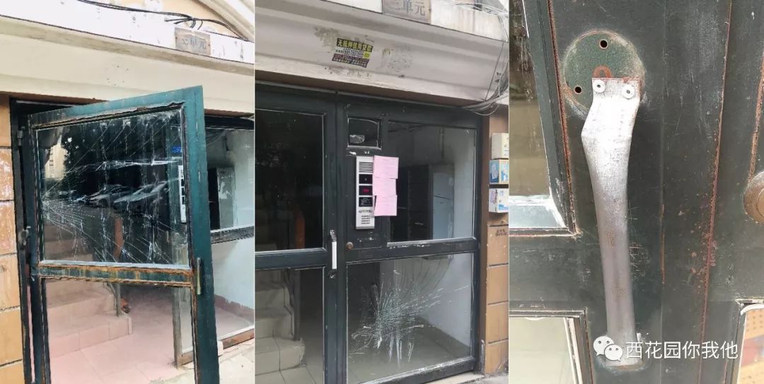 单元门破损、把手脱落。