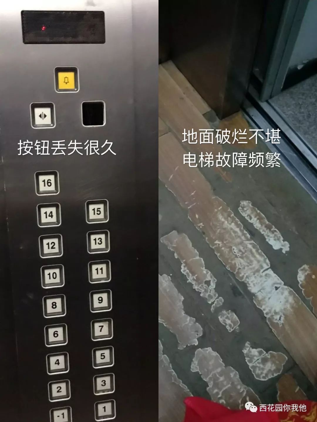 电梯地面破烂不堪、频繁故障,按钮“走失”。