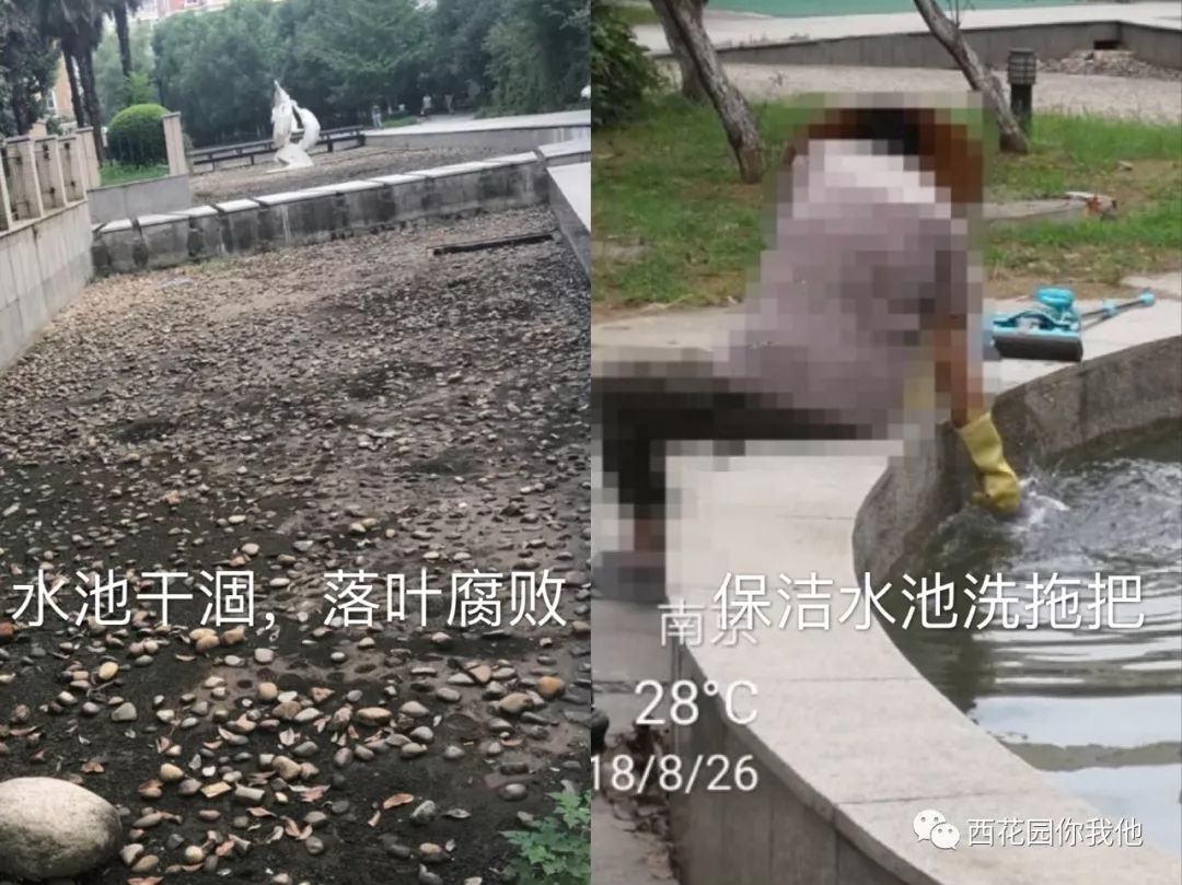 水池干涸,保洁人员用池塘内的水清洗拖把。