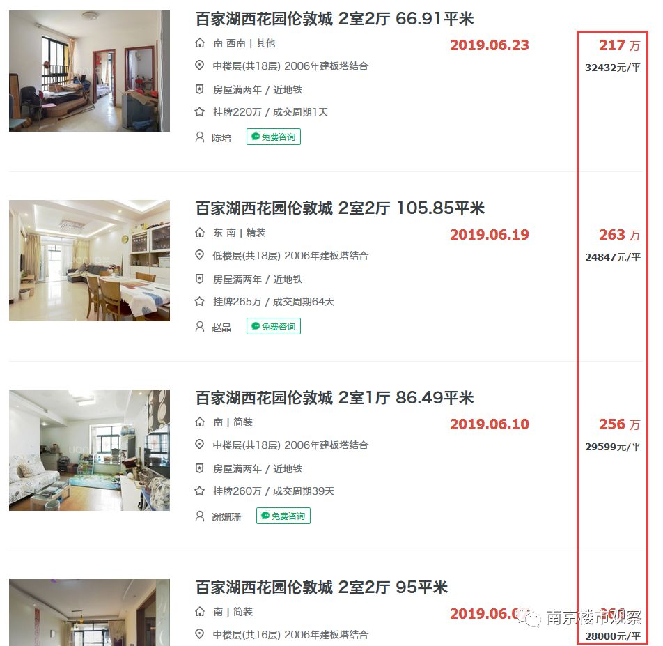 近段时间,小区内的成交记录如下图所示,最近成交的一套房源成交价为32432元/㎡,可是之前的价格却都在2万+/㎡左右。我向中介咨询其中原由,中介表示是因为面积的原因,考虑到后期转手等原因,小区面积越小的房源,价格则越高。