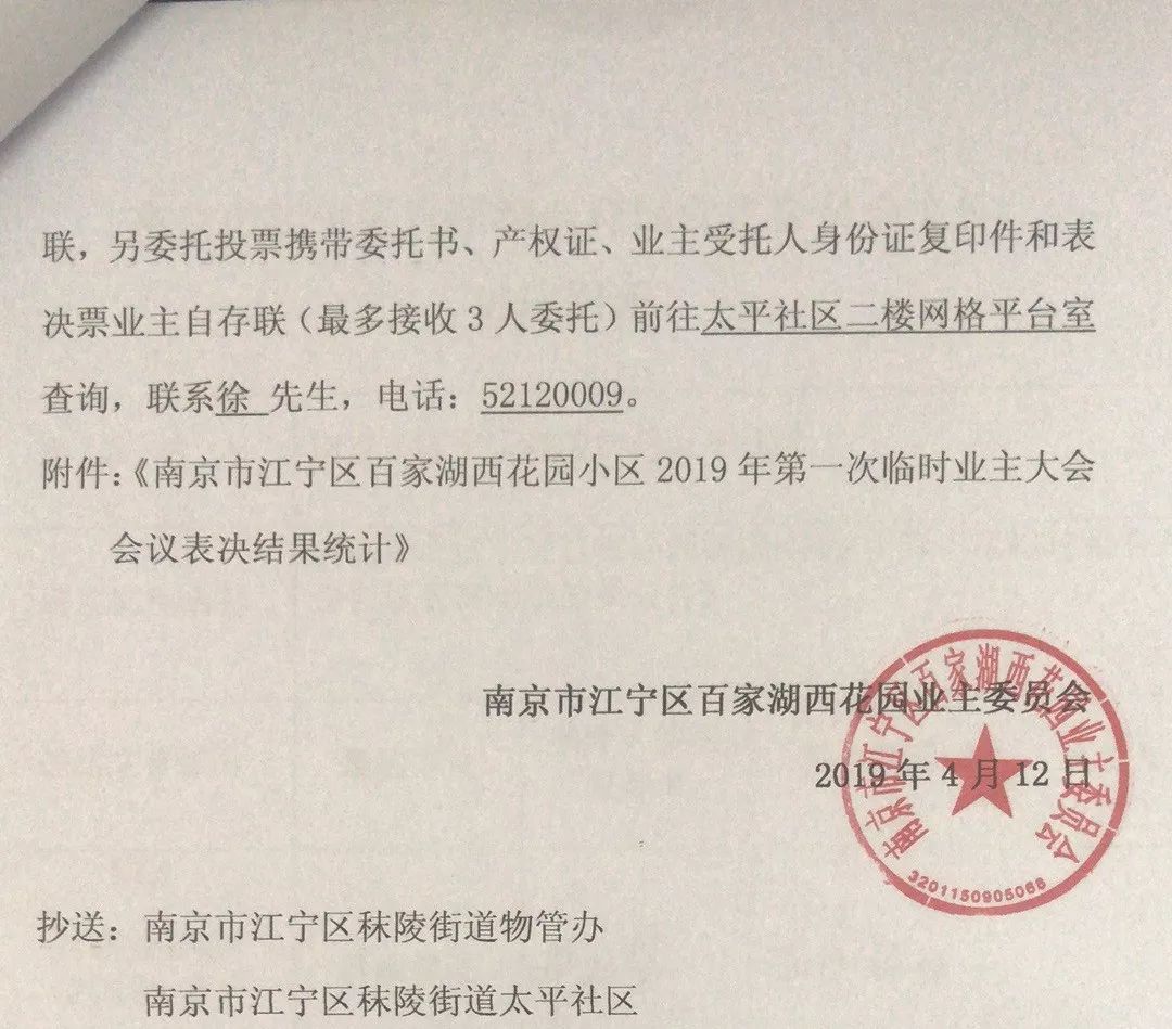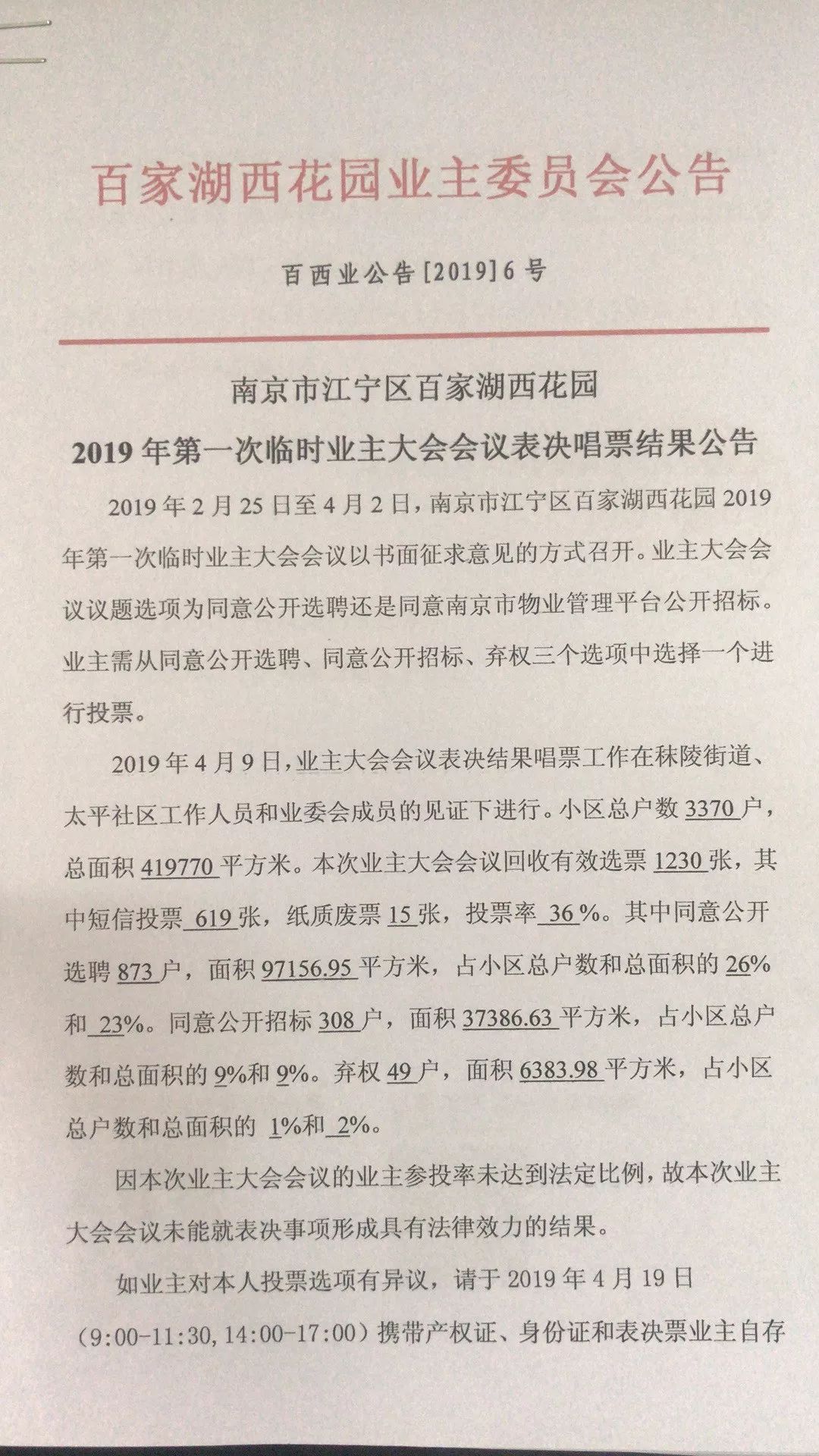 今年4月12日南京翠屏湾花园城二手房,小区业委会公告,关于同意公开选聘还是公开招标物业的结果显示,同意公开选聘873户,占小区总户数26%;同意公开招标308户,占小区总户数9%;弃权49户,占总户数1%。因业主参投率未达到法定比例,故投票结果不具有法律效力。